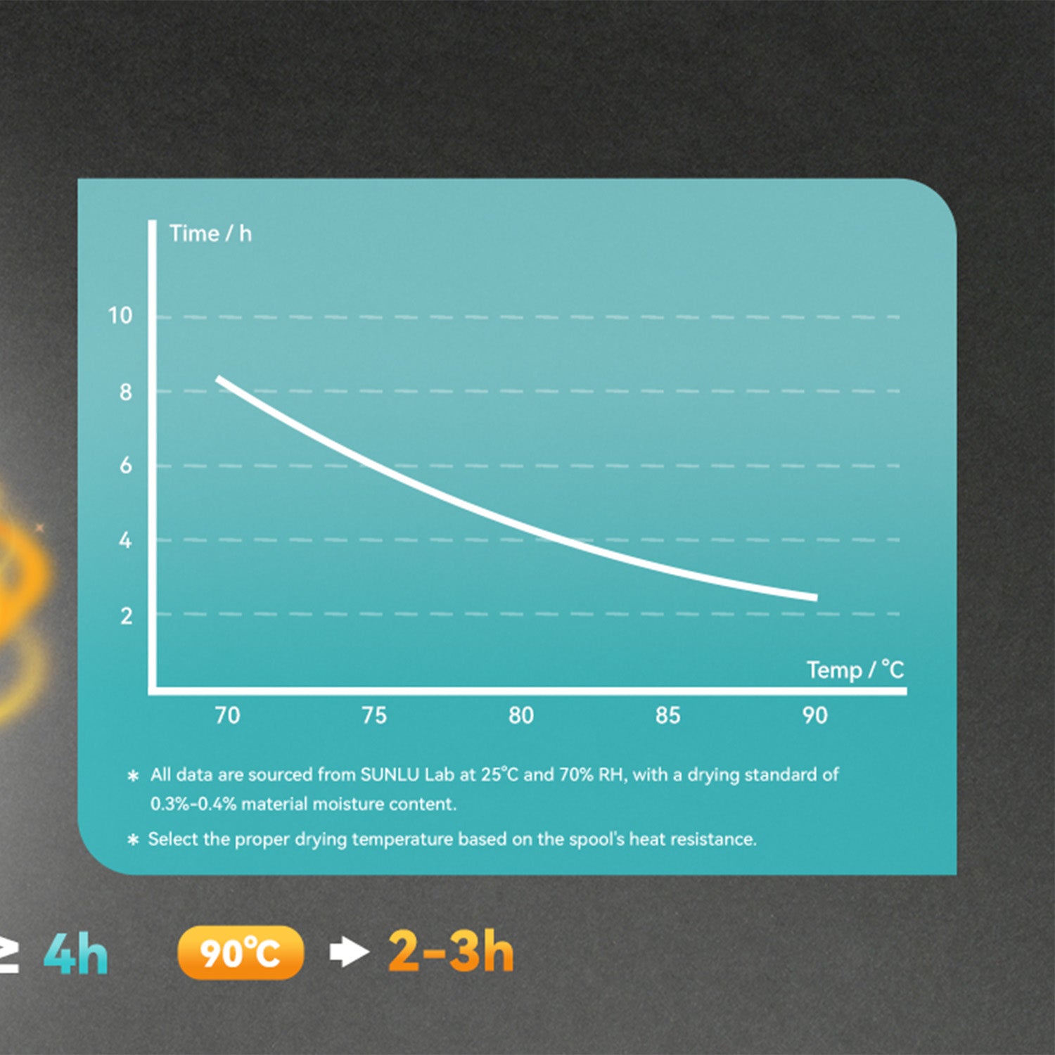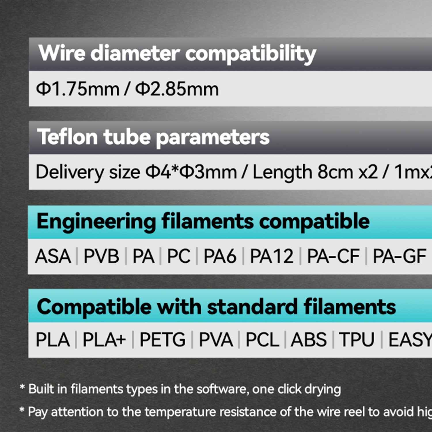 标准长丝加热至 70°C,并支持 90°C 干燥,显著减少 PA 和 PC 等功能长丝的干燥时间。