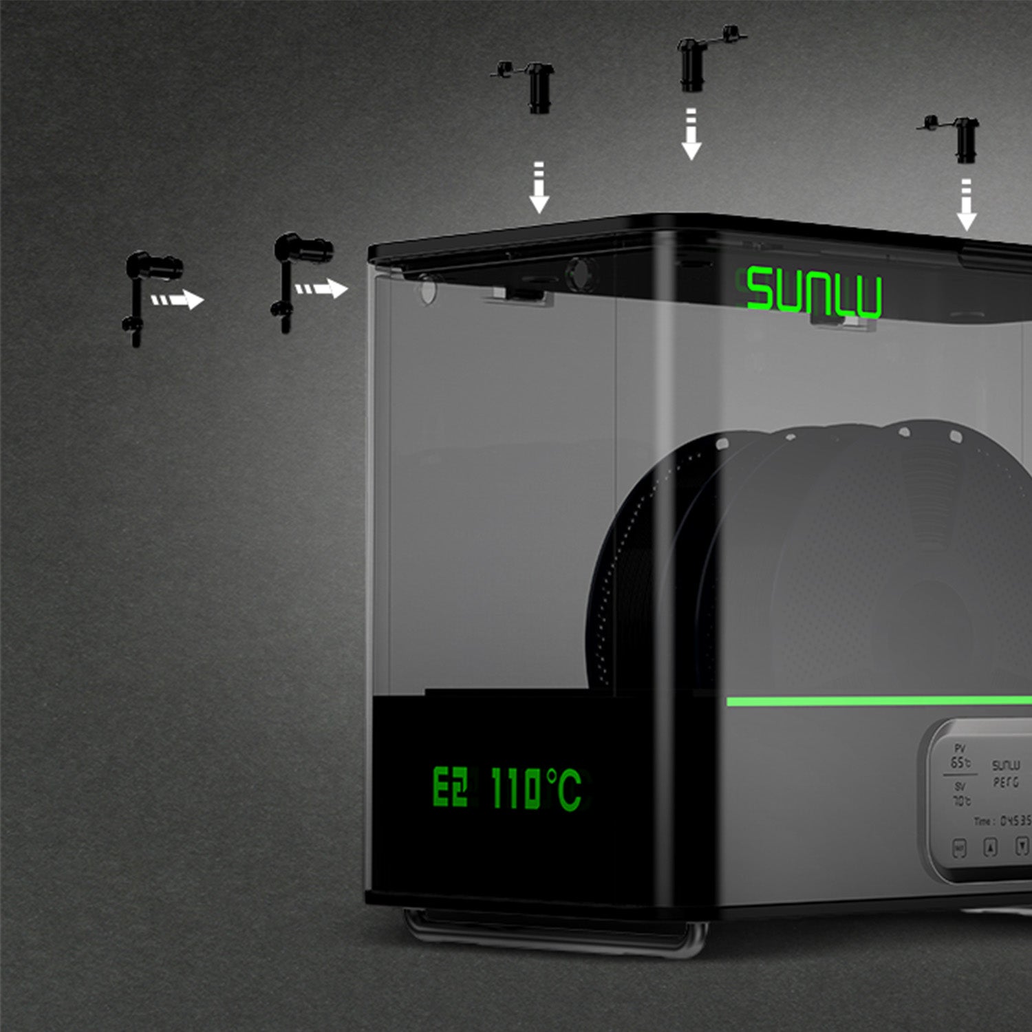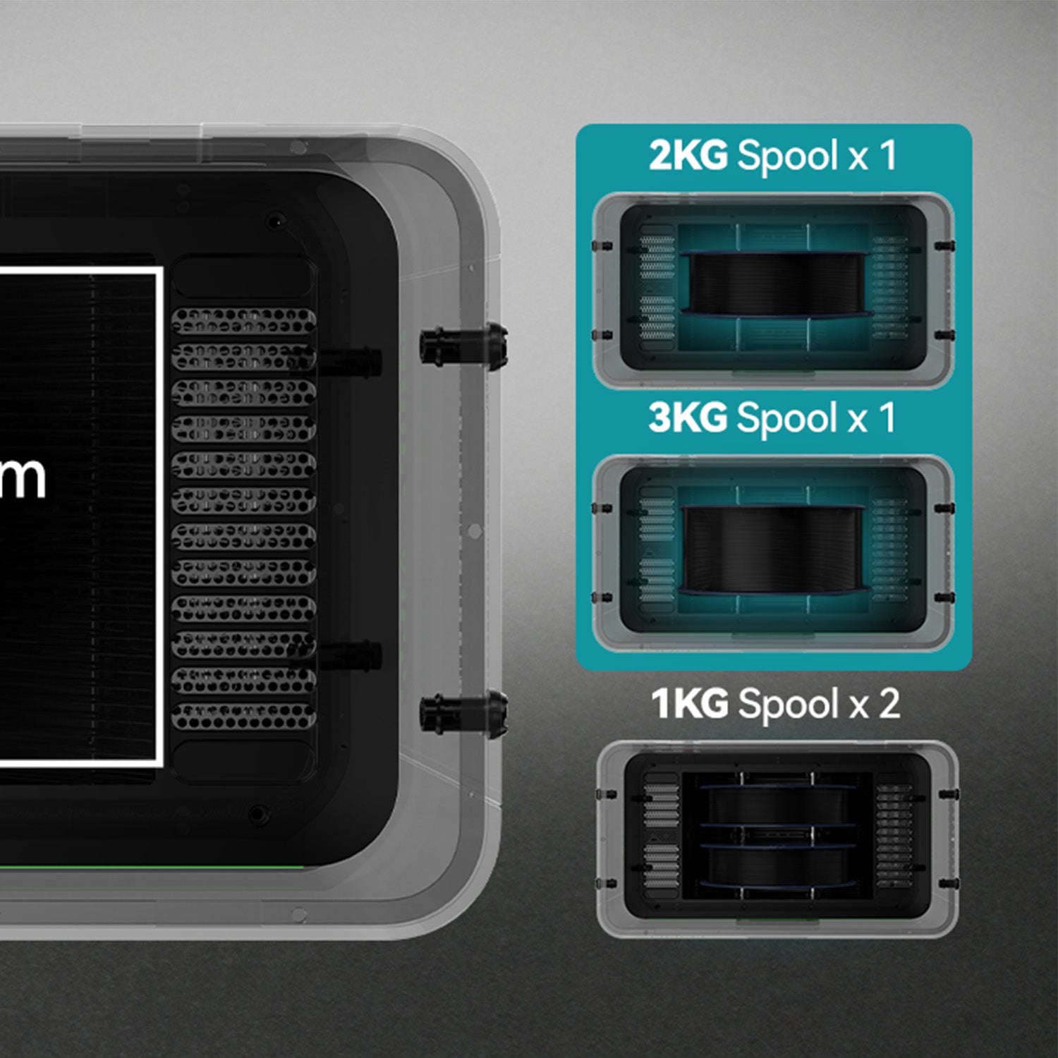 最多可容纳两个 1 公斤的线轴或一个 3 公斤的线轴,非常适合多卷或大卷长丝干燥,最大限度地减少频繁更换长丝的麻烦。