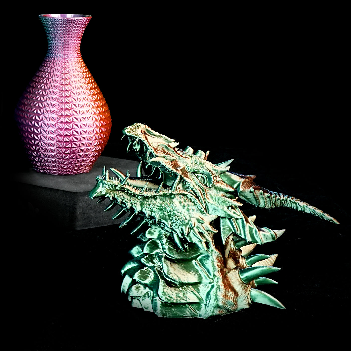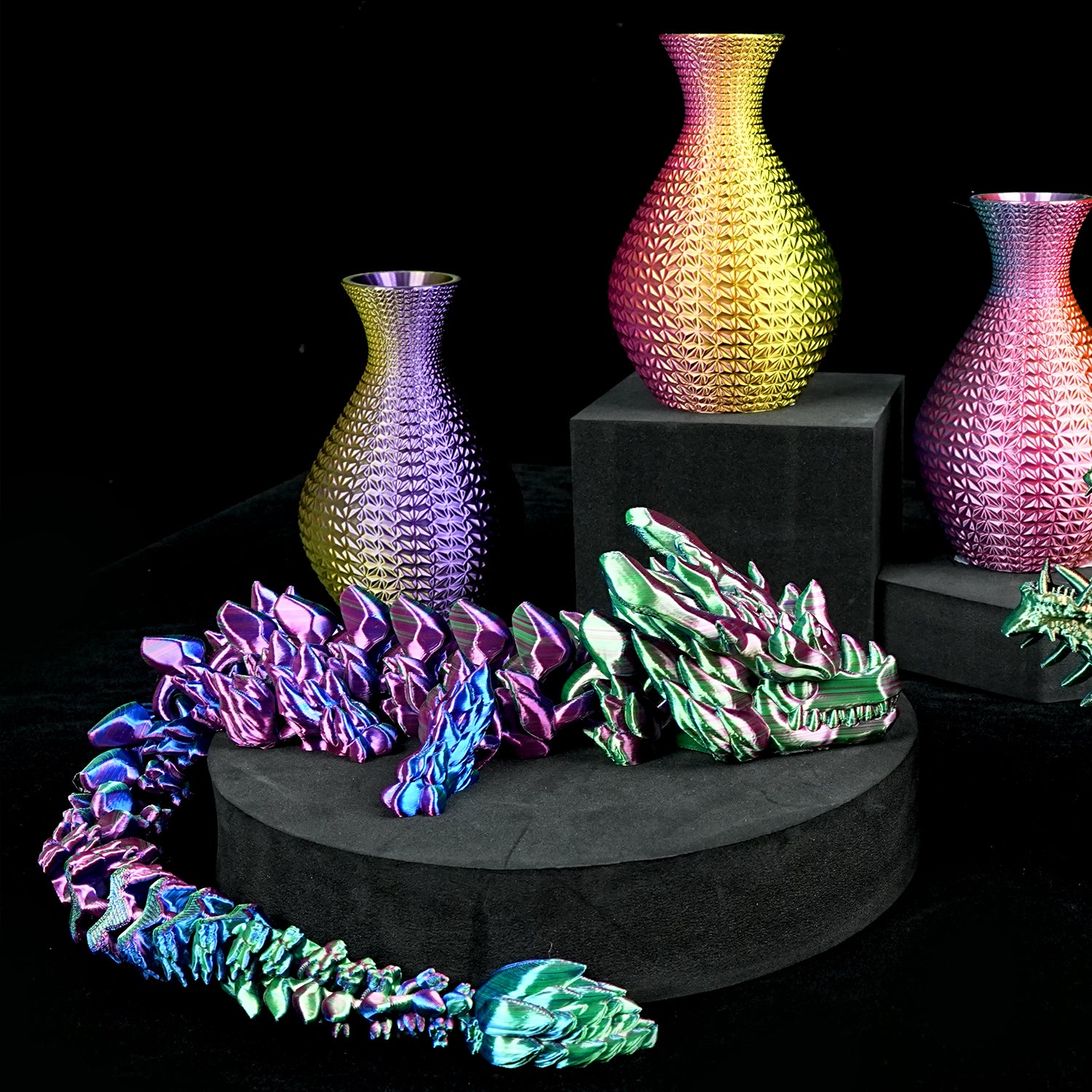 三绿PLA+丝绸三色打印作品表面光滑,不显层纹,呈现出如丝绸般的细腻触感和靓丽颜色。独特的双色效果使得模型在不同角度和面呈现出三种不同的颜色变幻,增加了作品的美感和视觉层次感。